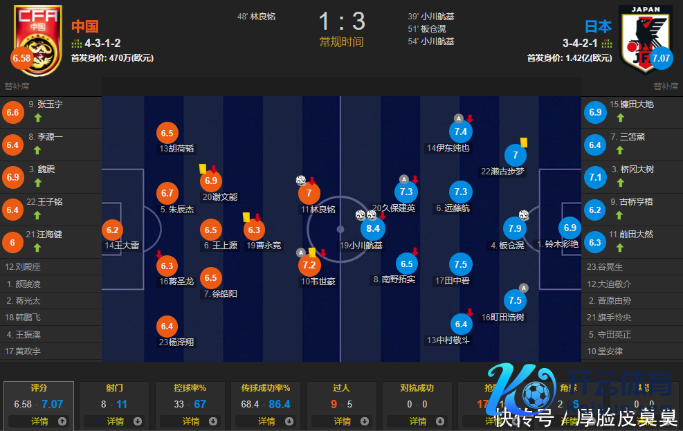 本场比赛国足的阿谁进球由谢文能发起,韦世豪助攻,林良铭打进。3东说念主王人是来自三个不同的俱乐部,林良铭诚然获取了国足5年来对阵日本的首球,但评分却不是最高的,以7.0分排在第2。林良铭极度鄙吝这难得庄重的首发契机,是以在比赛中踢得极度卖力。其实国足原土锋线,真的缺了谁王人能开动。